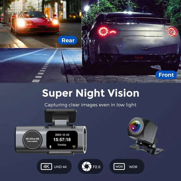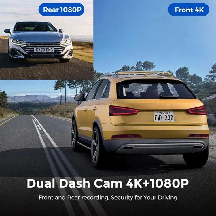 این دوربین داشبورد دوکاناله ویدئوهای 4K با کیفیت بالا ضبط میکند و امکان ثبت واضح پلاک خودروها و تابلوهای جادهای را فراهم میسازد. همچنین، از ضبط همزمان دوگانه پشتیبانی میکند، مانند دوربین جلو + دوربین داخلی یا دوربین جلو + دوربین عقب.