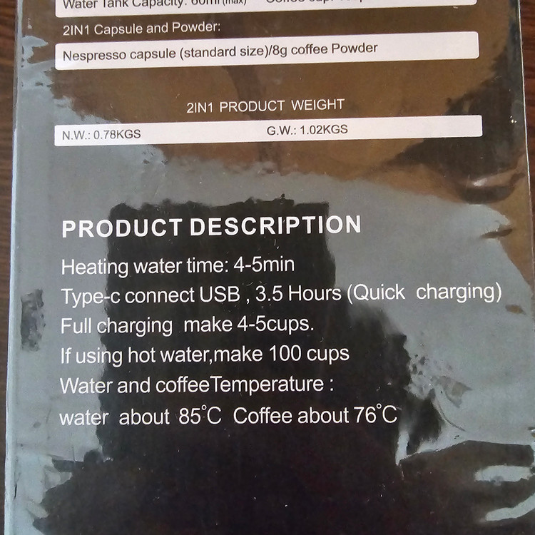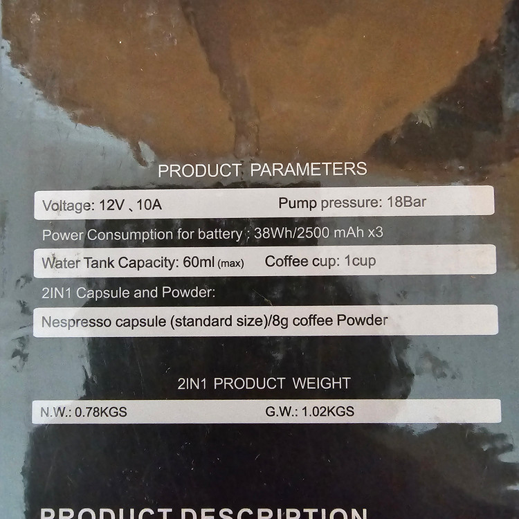شارژی.قابلیت جوش آوردن آب تا ۸۵ درجه.کارکرد با پودر قهوه و قرص قهوه.۱۸ بار واقعی.بسیار با کیفیت